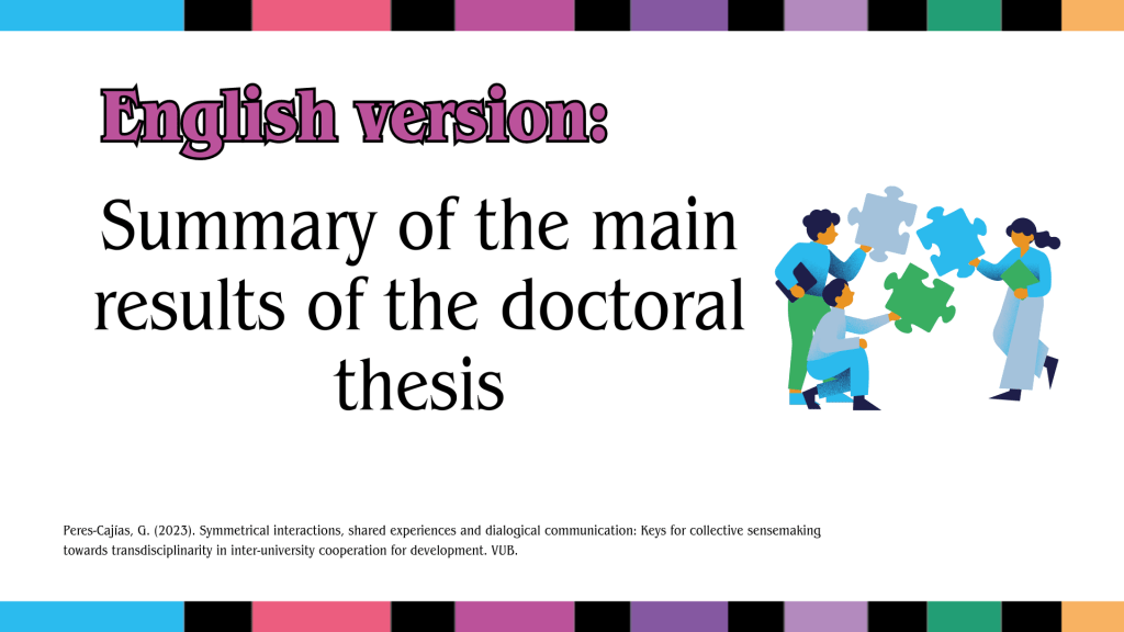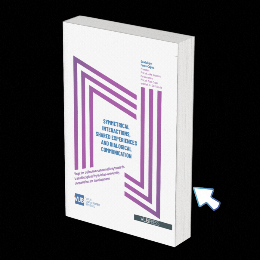 Iniciamos con mi tesis doctoral (VUBPRESS, 2023). Esta investigación buscó comprender el papel de la comunicación organizacional interpersonal en la producción de sentido sobre la transdisciplinaridad, en un programa de cooperación académica para el desarrollo. Al ser investigadora y participante en este programa, mi trabajo tuvo un enfoque de investigación-acción en primera persona, con una perspectiva etnográfica, una estrategia abductiva, métodos cualitativos de recolección y análisis y…una innovadora metodología para la investigación acción: «el análisis auto reflexivo». Les invito a leer el documento. Hagan clic en la imagen del libro. Y si aún no se animan, aquí dejo algunas líneas y unos videos para que vean por qué amo tanto mi tesis doctoral.